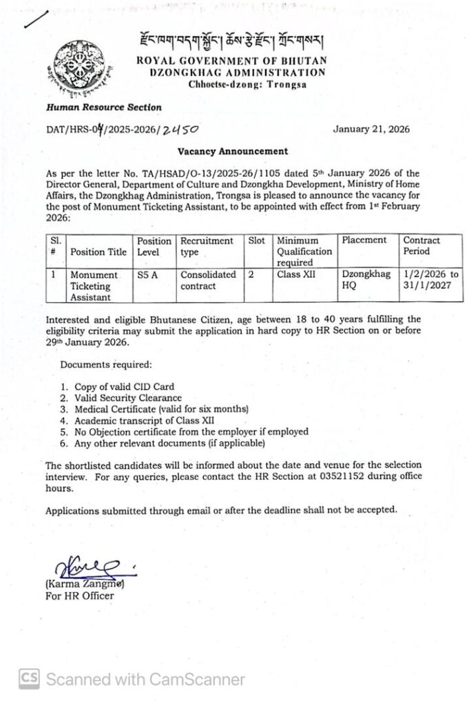 HomeVacancies📢 Calling Interested Applicants!Trongsa Dzongkhag Administration is pleased to announce a vacancy for the post of Monument Ticketing Assistant.Eligible Bhutanese citizens are encouraged to apply on or before 29 January 2026.📎 See notice for details.